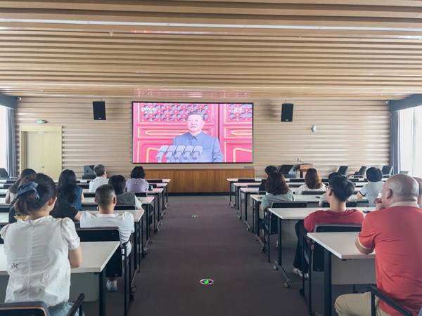 上午9時,全體員工聚精會神地觀看直播畫面,不時發出陣陣贊嘆。當國旗護衛隊邁著鏗鏘有力的步伐走向升旗區,當雄壯的《義勇軍進行曲》響徹天安門廣場,觀看現場的員工們自發起身,與現場同步高唱國歌,表達對祖國的深切熱愛和崇高敬意。