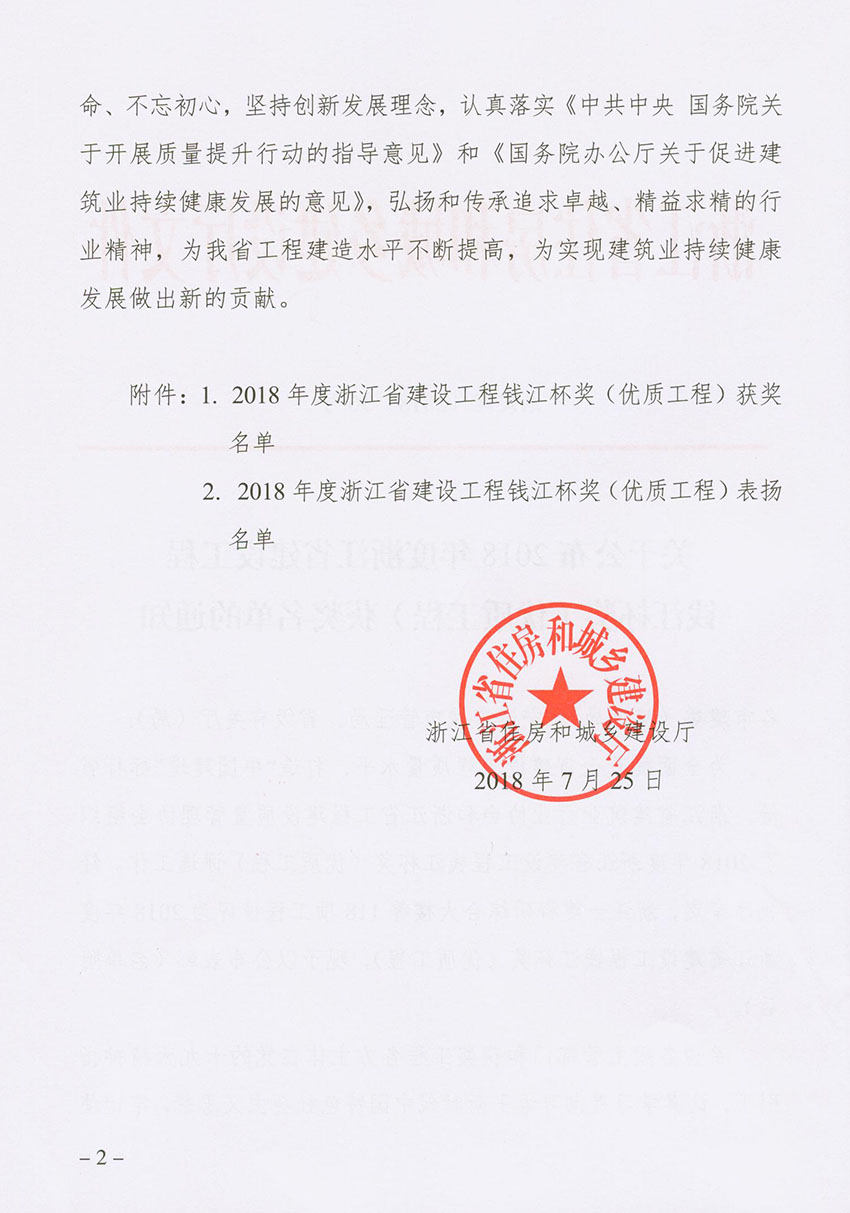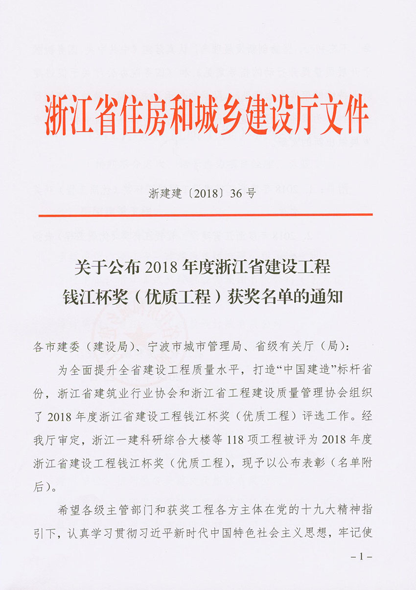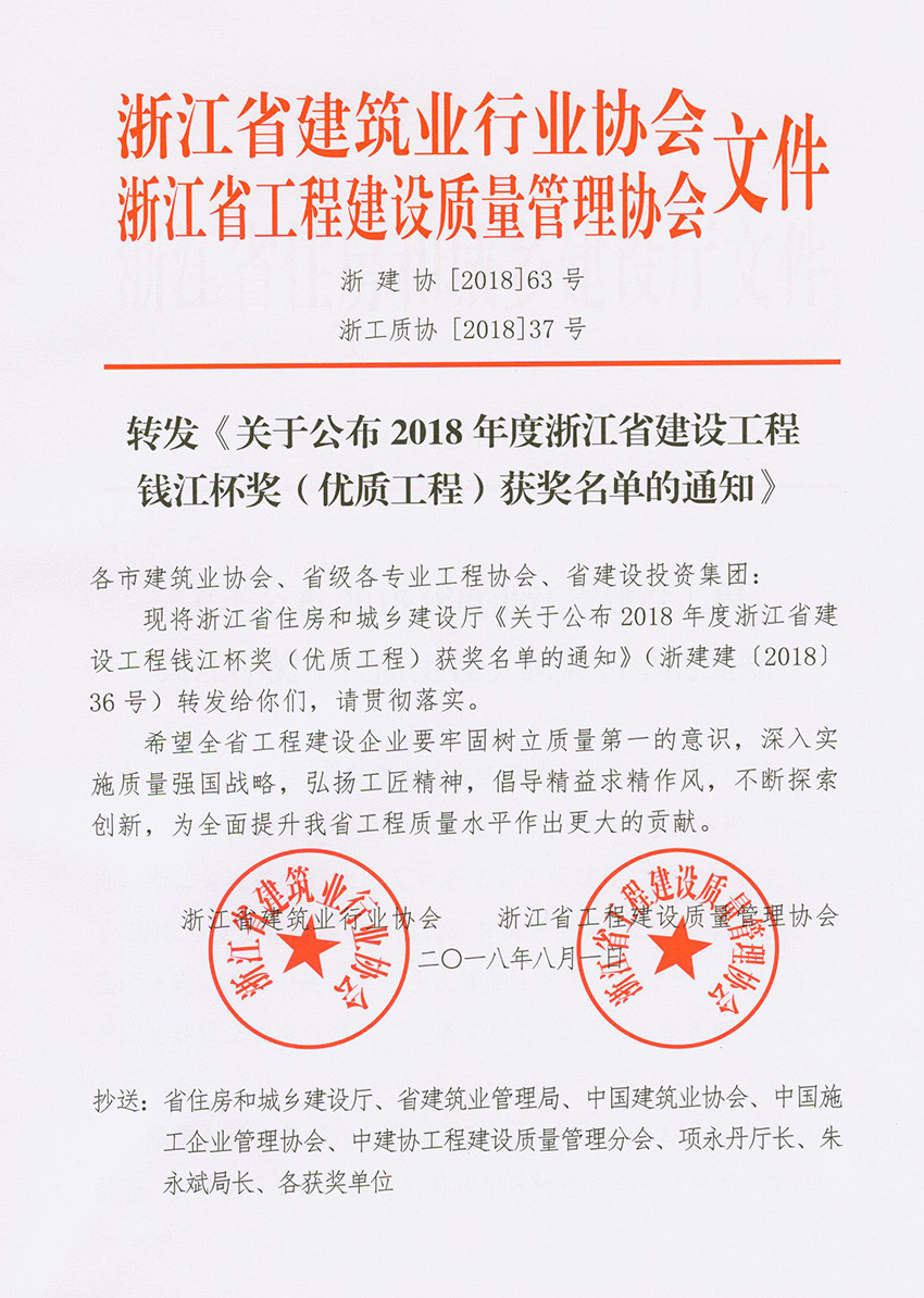 喜報!近日,省建設廳頒發了2018年度浙江省建設工程“錢江杯”(優質工程)文件,我公司“麗水市體育館體育中心工程、松陽縣供電局電力調度生產綜合用房工程”分別獲得2018年度“錢江杯”(優質工程)獎。