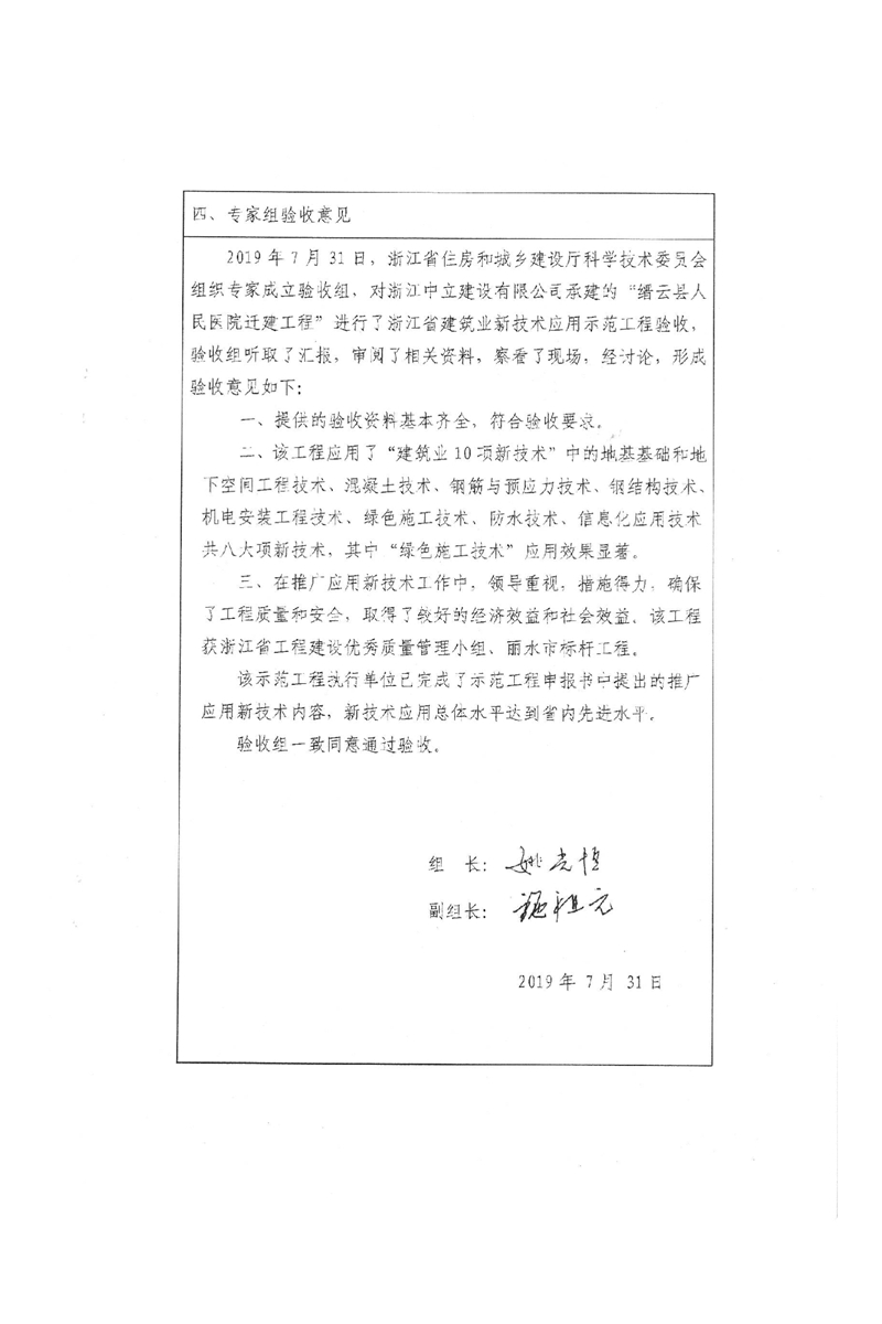 我公司承建的“縉云縣人民醫院遷建工程”通過了浙江省建筑業新技術應用示范工程驗收。該工程是我公司也是麗水市本地企業首次榮獲浙江省建筑業新技術應用示范工程,取得了較好的經濟效益和社會效益。通過開展技術創新活動是我公司提升企業知名度,提高整體技術管理水平,鍛煉隊伍培養人才的重要途徑。